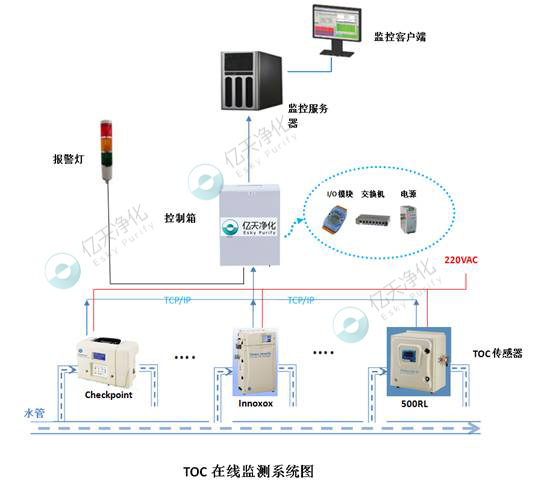 系統(tǒng)主要是由TOC傳感器、電控箱、服務器及監(jiān)測軟件組成。通過CheckPoint TOC傳感器采集數(shù)據(jù),電控系統(tǒng)傳輸數(shù)據(jù),監(jiān)控服務器負責保存處理數(shù)據(jù),達到數(shù)據(jù)實時在線監(jiān)測目的,還可以提供各種輔助功能,如:TOC歷史數(shù)據(jù)查詢、圖表生成、操作記錄、報警預警等,幫助用戶及時發(fā)現(xiàn)問題、分析問題、解決問題。
