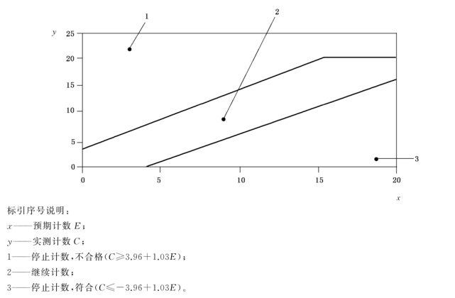 e) 如果累積實(shí)測計數(shù)穿過上限,在該點(diǎn)停止采樣,認(rèn)為空氣不符合規(guī)定的等級限值; f) 如果累積實(shí)測計數(shù)穿過下限,在該點(diǎn)停止采樣,認(rèn)為空氣符合規(guī)定的等級限值;