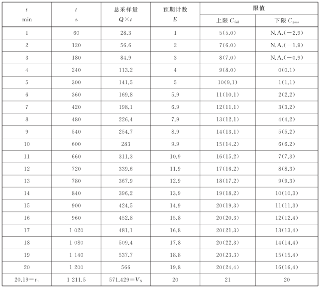 g) 如果累積實(shí)測計數(shù)保持在上限與下限之間,采樣將繼續(xù)進(jìn)行,如果在規(guī)定的采樣周期內(nèi),總計數(shù)達(dá)到或小于20,并且未穿過上限,則空氣符合指定級別的限值。