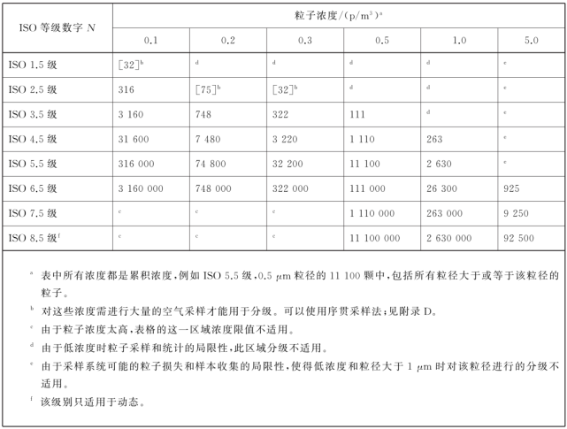 注1:規(guī)定了按空氣懸浮粒子濃度劃分的級別。