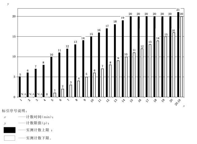 在圖 D.2 中畫出了實(shí)測計數(shù)的上下限與計數(shù)獲取時間之間的關(guān)系。其所在列表示的是在1 min 的時間間隔內(nèi)的限值(上限和下限)。